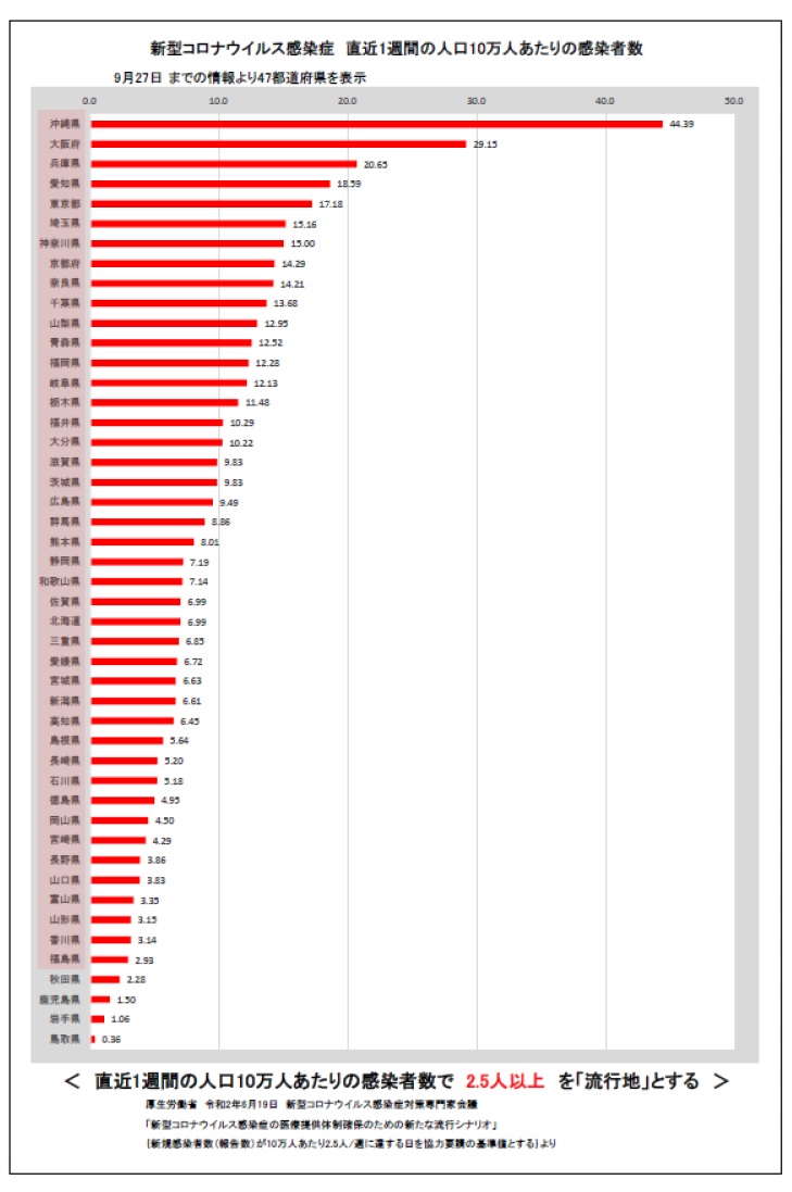 新型コロナウイルス感染症直近1週間の人口10万人あたりの感染者数について、お知らせします。