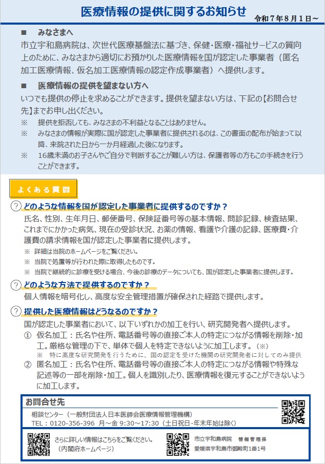 次世代医療基盤法に基づく医療情報提供のお知らせ 2025年8月20日(水曜日) お知らせ(その他) 医療情報の提供に関するお知らせ 次世代医療基盤法について(内閣府ホームページ) 2025年9月 糖尿病教室のお知らせ【愛媛県立医療技術大学】病院見学ツアー実施!
